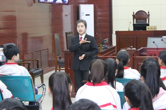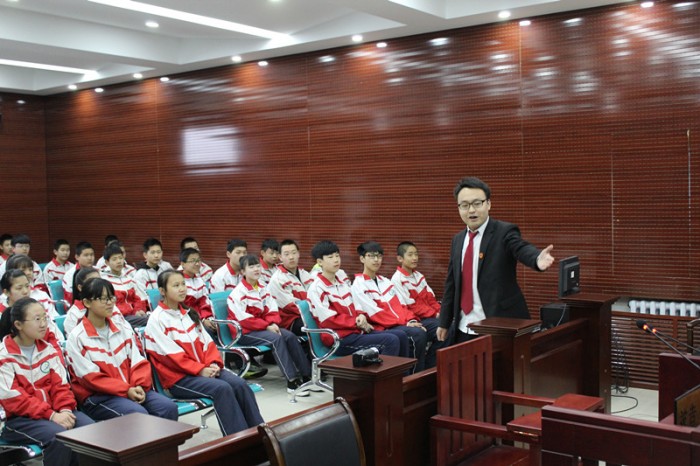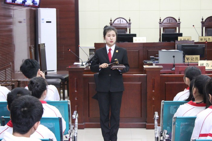9点整,同学们井然有序地落座到一楼审判庭,法官助理赵茂盛给他们带来一堂幽默、生动的普法教育课,他用故事的形式为同学们介绍一个又一个案例,通过案例,传递给同学们在他们那个年龄段应该懂得的法律法规,赵茂盛用平铺直叙、深入浅出的方法将一条条难懂的法条讲解出来,同学们们时而认真严肃、时而紧张惊讶的听完了这节普法课程。