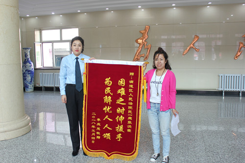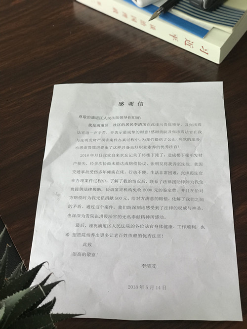 “感谢法官,我为张洪霞法官的无私奉献精神所感动。”5月15日一大早,滴道区居民李清茂来到滴道法院,将满载感谢的感谢信和致谢锦旗送给了法官张洪霞。