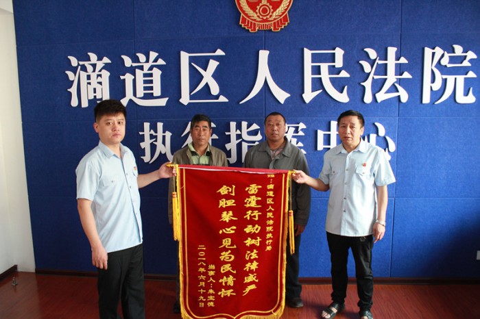 6月19日上午,当事人朱某亲手将一面书写有“雷霆行动树法律威严,剑胆琴心见为民情怀”的锦旗送到了滴道法院,以表感谢执行干警高效执行之心,使其工伤仲裁赔偿款能最终执行到位。