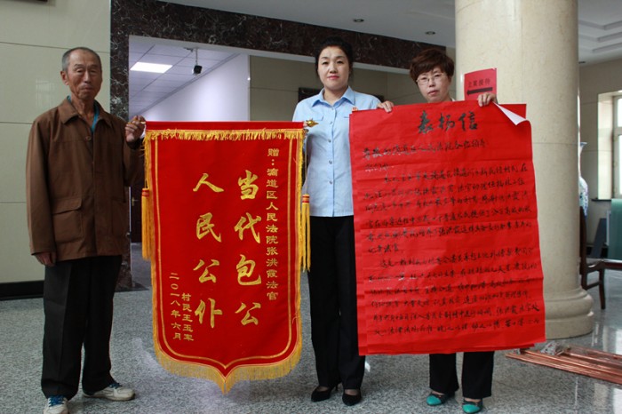 6月25日,滴道河乡新民村村民王某专程来到滴道法院,将一面写有“当代包公 人民公仆”的锦旗送到了张洪霞法官手中,感谢她在案件执行中的公正为民,让自己拿到了期待已久的土地补偿款。