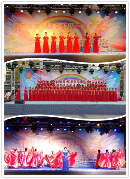 本场文艺演出以庆祝中国共产党97周年为主题,通过歌唱经典红色歌曲、诗歌朗诵、民族舞蹈等艺术形式讴歌党的光辉历史,真情再现了十九大以来滴道区的新气象、新作为,以及广大党员干部率先垂范、服务为民的精神气象。全体演职人员用优美的歌声表达了对党的热爱,用动人的舞姿抒发了对党的赞美。