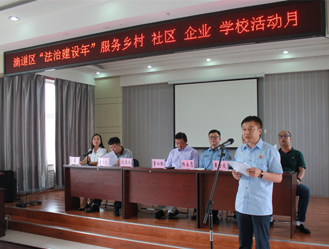 在区政法委“法治建设年”“法律进基层”服务乡村、社区、企业、学校活动月启动仪式上,滴道法院党组书记、院长赵鸿江向人民群众许下庄严承诺。