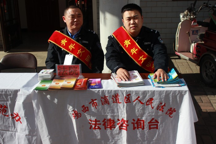 9月28日下午,滴道法院组织4名干警深入金铁鑫村开展“送法进乡村”活动。滴道法院青年文明号干警向当地村民发送了《民事诉讼指南》、《诉讼费用缴纳》、《法律咨询服务手册》等法律法规宣传资料50余份,并现场接受法律咨询。
