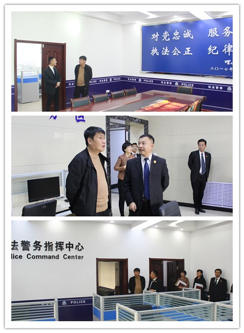 在赵鸿江院长的引领下,王立波一行参观了滴道法院的诉讼服务中心、家事审判法庭、科技法庭等基础设施建设工作。