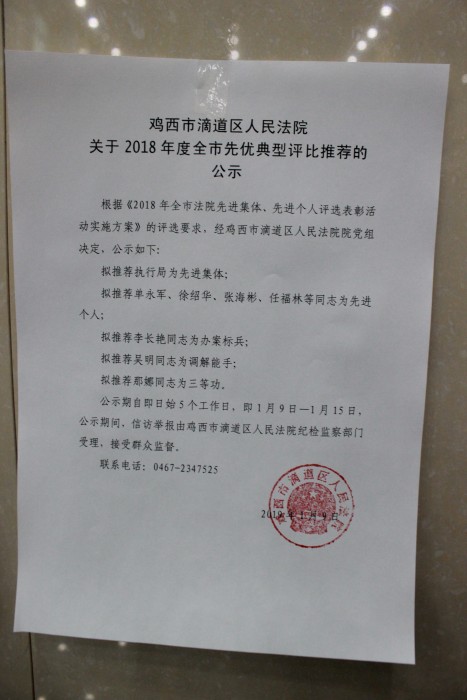 鸡西市滴道区人民法院关于2018年度全市先优典型评比推荐的公示