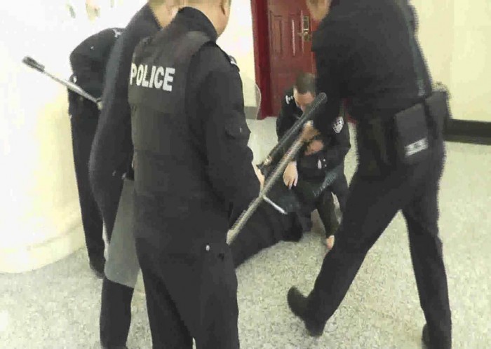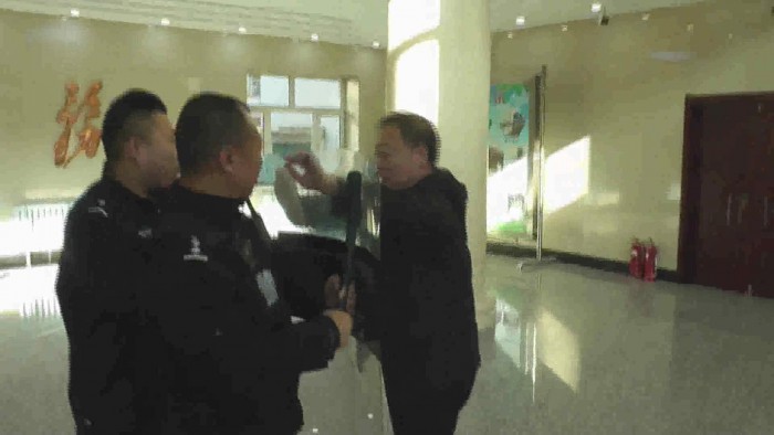 演练的背景为个别当事人对判决不服,强行闯入办公区域,执勤法警进行劝阻无效,呼叫备勤法警,备勤法警迅速出警并控制当事人,成功处置本次突发事件。