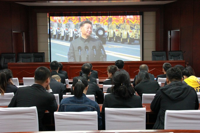 阅兵仪式上,仪仗方队、民兵方队、女兵方队等组成的受阅队伍整齐划一的从天安门前走过,军乐嘹亮、口号高亢、步伐铿锵有力,展示了人民军队威武之师、文明之师、和平之师的新形象,展示了全国各族人民团结一心、昂扬向上的精神面貌。气势恢宏的场面使得干警们热血沸腾、掌声不断,强烈的民族自豪感和国家荣誉感在心底油然而生。