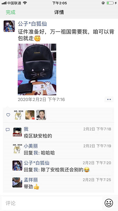 早在2月2日,于雪娇就曾发过状态“证件准备好,万一祖国需要我,咱可以背包就走。”一个行囊、两个证件,她是早就做好冲锋前线的准备。她曾前后两次在共青团和院里自发捐款,做出自己的一份努力。当院里微信群发布召集志愿者的通知后,她第一时间报名,领导劝她,抗“疫”前线有男同志,女同志还是做好留守工作,她执拗的坚持:“疫情就是警情”,背上行囊,戴好口罩,义无反顾踏上逆行之路。