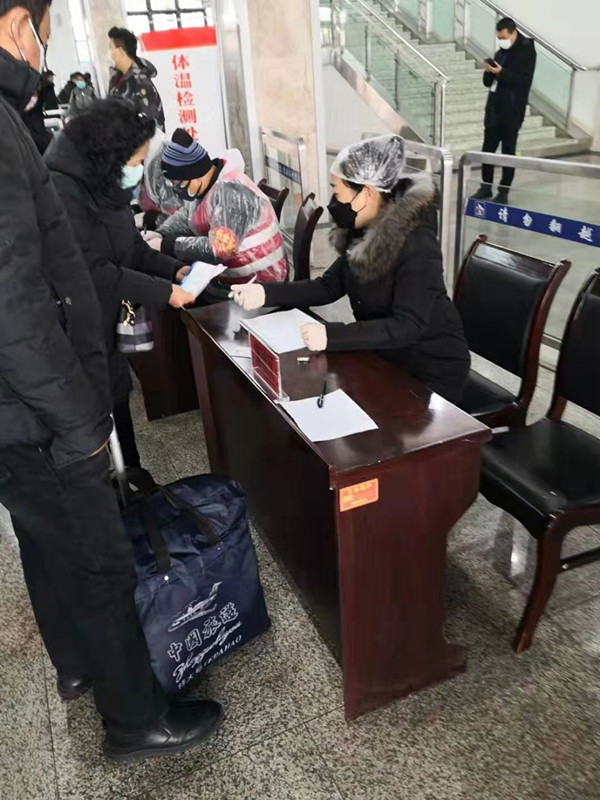 8时16分,从哈尔滨发往鸡西的k7155次列车进站,这列车共计有旅客三十人左右,其中有两人要回滴道,于雪娇例行询问,此二人从太原搭乘飞机出发经哈尔滨中转到鸡西滴道区七组团,做好登记后,她联系了滴道法院派出的警车将旅客送回滴道区防疫检测站。