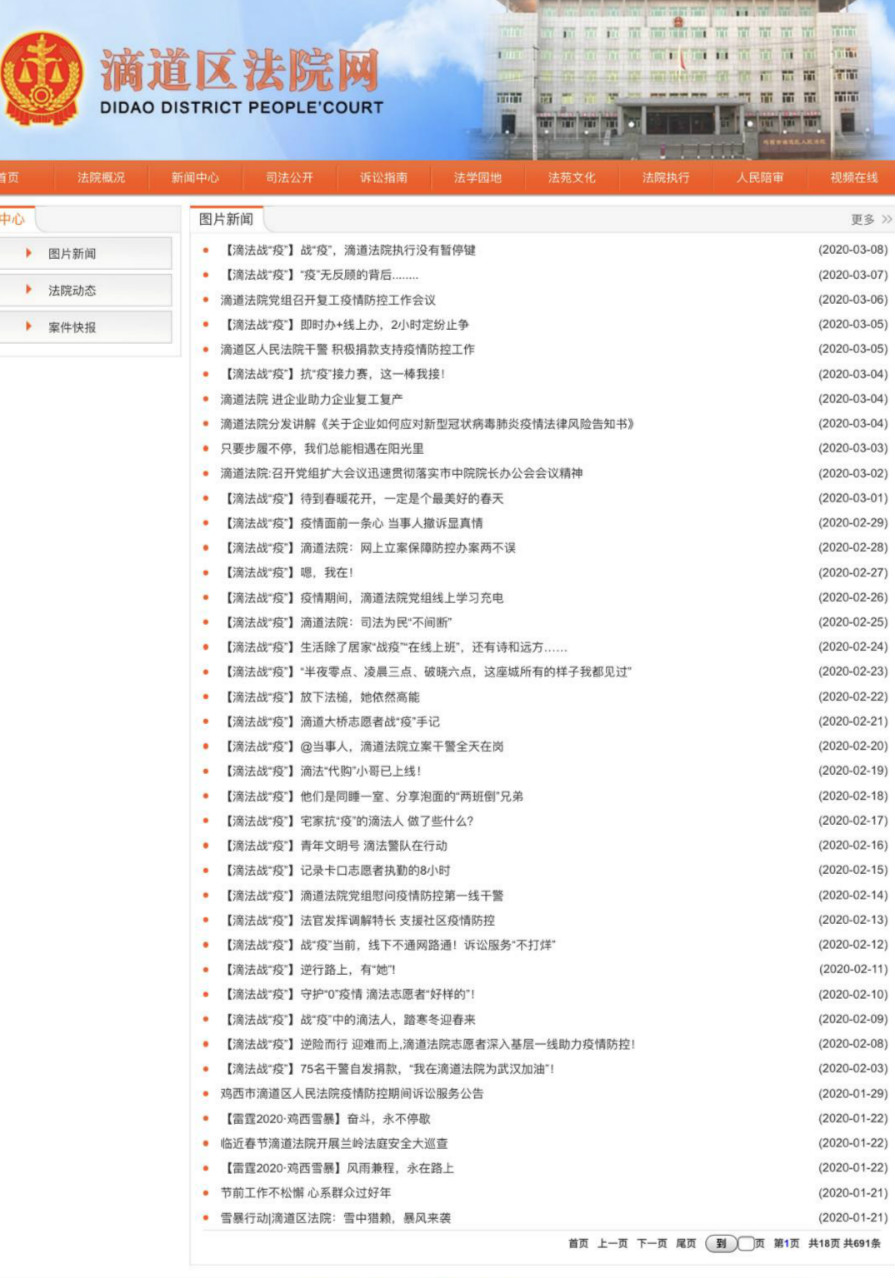 做新闻关心什么?关心新闻中的人——由此,滴道法院宣传干警那娜2月8日推出《滴法战“疫”》第一期以来,不间断地坚持每日必发,已策划采写31篇新闻报道,其中20篇人物专访,多篇被中院、省院、鸡西新闻网转发。