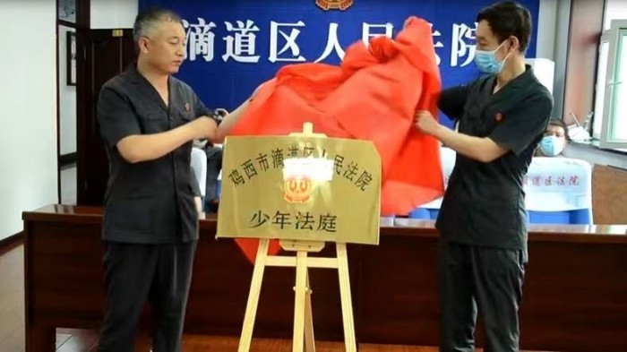 为贯彻落实《最高人民法院关于加强新时代未成年人审判工作的意见》,进一步做好保护和预防未成年人犯罪工作,7月6日14时,滴道区人民法院参加全省法院第一批少年法庭集中挂牌(揭牌)仪式,滴道法院党组书记、院长赵鸿江与少年法庭工作负责人安丰军为少年法庭成立进行揭牌,各部门相关负责人与部分干警参加揭牌仪式。
