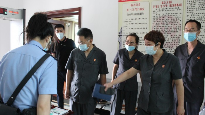 在兰岭法庭,苑司新现场检查了扫码、体温检测、来访人员登记等疫情防控流程,以及法警安检、警务保障设施和装备配备情况,仔细查看了兰岭法庭的基础设施建设、办公生活环境和文化建设情况,听取了庭长吴明的工作汇报。