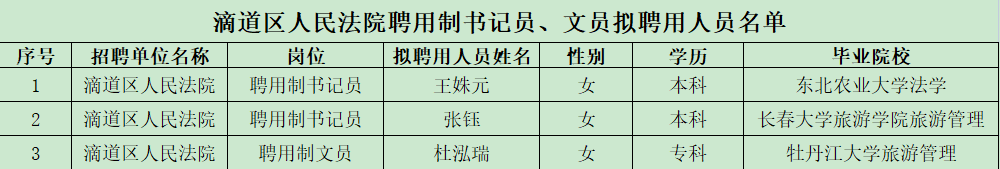 依据《滴道区人民法院聘用制书记员、文员招聘录用考试实施方案》规定,为加强聘用制书记员、文员选拔任用工作的民主监督,现将拟聘用人员名单进行任前公示,公示期限为2021年11月5日至2021年11月15日(7个工作日)。本次考试拟聘用王姝元、张钰等2名同志为聘用制书记员,杜泓瑞为聘用制文员。现予以公示。