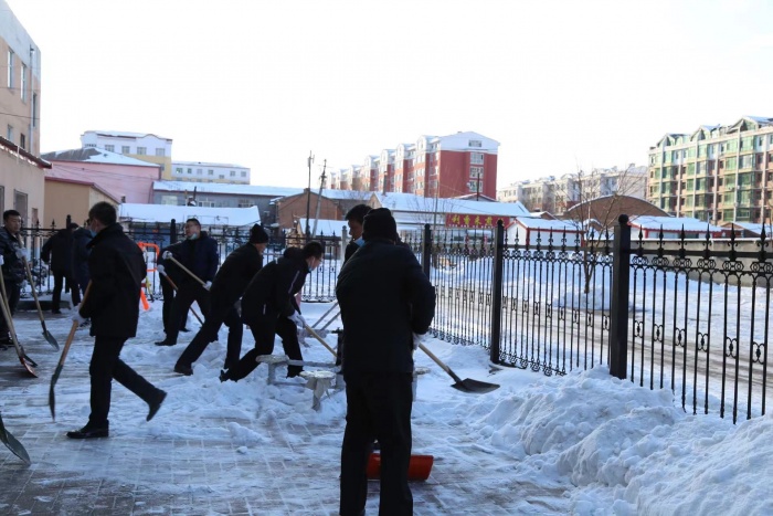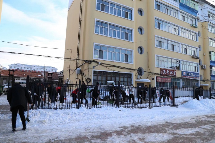 干警们拿着除雪锹、大扫把等工具轮流上阵,对弃管楼进行清雪除冰,尽管天气严寒、大风呼啸,干警们仍旧不懈努力地清理积雪,经过几个小时的努力,楼旁道路积雪全部清扫干净,确保行人车辆通道安全畅通,为居民营造了一个整洁有序、安全出行的居住环境。