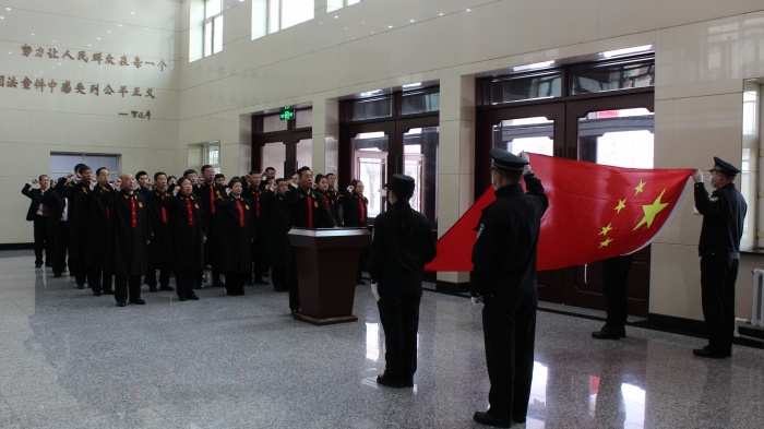 宣誓开始后,四名司法警察正步护送国旗入场,全体干警身着制服,胸佩法徽,肃然站立,党组副书记、常务副院长张君起左手抚按《中华人民共和国宪法》领誓,全体干警齐声复诵:“我宣誓:忠于中华人民共和国宪法,维护宪法权威,履行法定职责……”