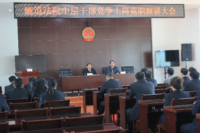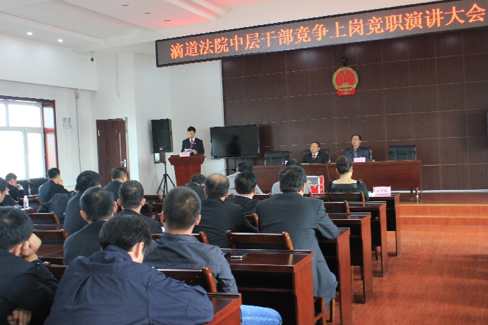 为深化干部人事制度改革,加强法院队伍建设,根据《公务员法》、《党政领导干部选拔任用工作条例》、《鸡西市乡科级干部选拔培养和管理办法(试行)的通知》、《县(市、区)法院、检察院乡科级干部选拔任用工作宏观指导意见》等相关规定,滴道区委组织部依照公开、公平、公正的原则,经过组织动员、申报参选、资格审查、竞职演讲、民意测验、组织考核等程序,对滴道法院6个岗位中层领导干部进行遴选。