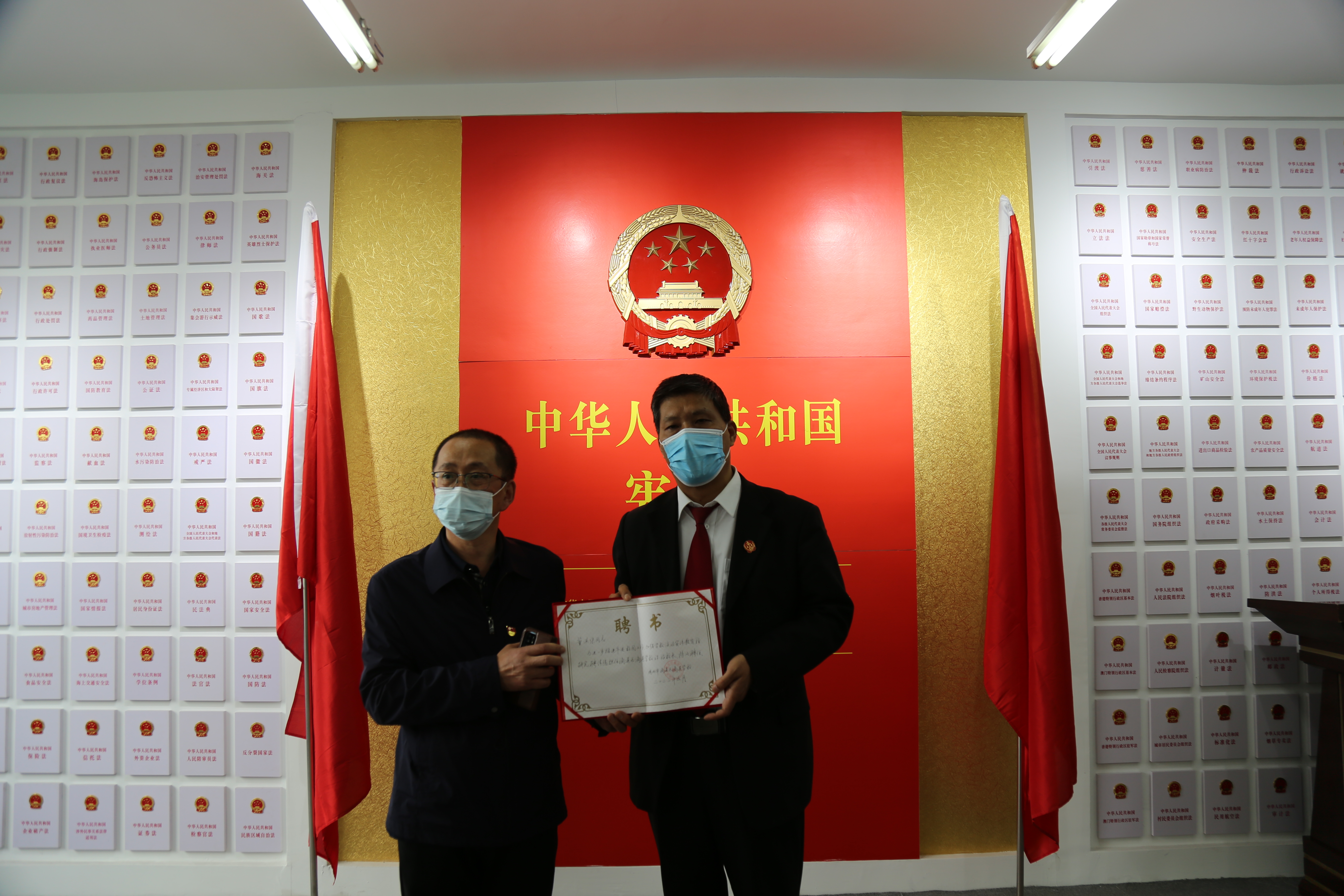 兰岭小学校长王洪洋为法官助理崔永霖颁发聘任书