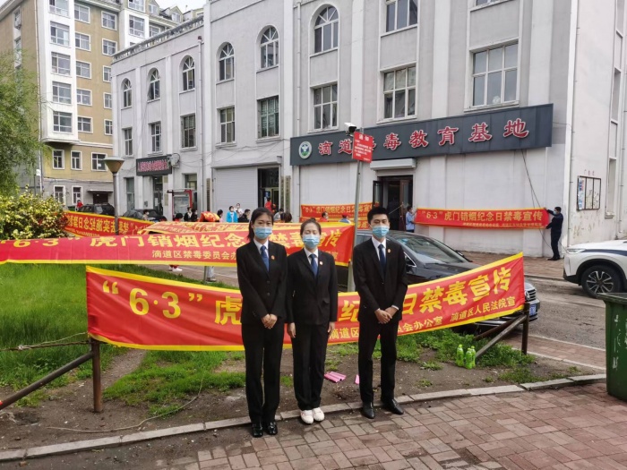 滴道区人民法院积极响应区禁毒委号召,于2022年6月3日在滴道区禁毒教育基地,组织开展继承虎门销烟精神,启动禁毒宣传月主题教育活动。活动中,干警们悬挂了宣传条幅,参观了禁毒教育基地虎门销烟人物事迹介绍组图,并向辖区群众发放了宣传材料,展示了毒品模型,讲解了毒品犯罪的危害和对普通群众的影响。