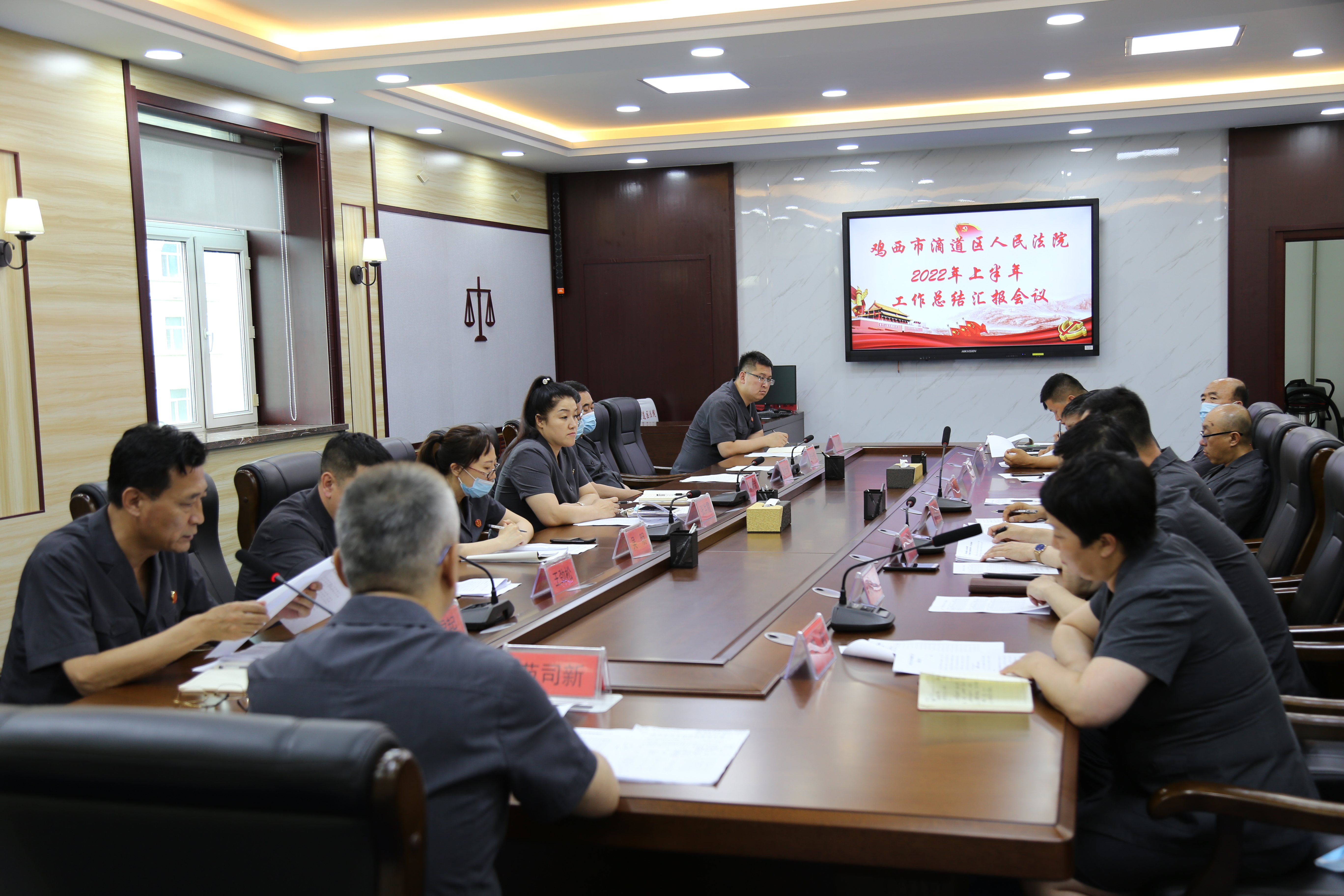 7月7日,滴道区法院召开2022年上半年工作总结汇报会议,院党组成员、各部门负责人、全体员额法官和法官助理参加会议。