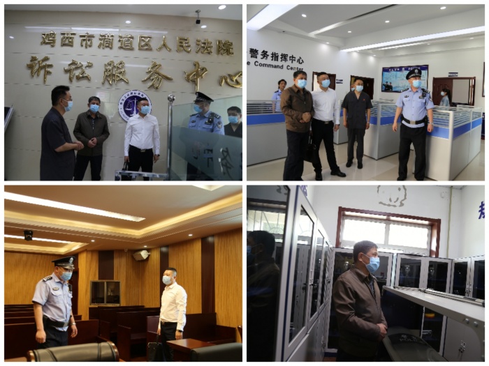 李伟、何琨一行首先来到诉讼服务中心,对滴道法院接待来访群众进入服务大厅扫码、测温登记等落实疫情防控要求进行了检查,随后对司法警务中心、羁押室、刑事法庭等进行查看,对司法警察大队安全保卫工作给予充分肯定,并针对如何规范开展安全检查工作、处置突发事件、提高司法警察技能等重点工作进行了现场指导,并对“六专四室”的建设提出整改意见。