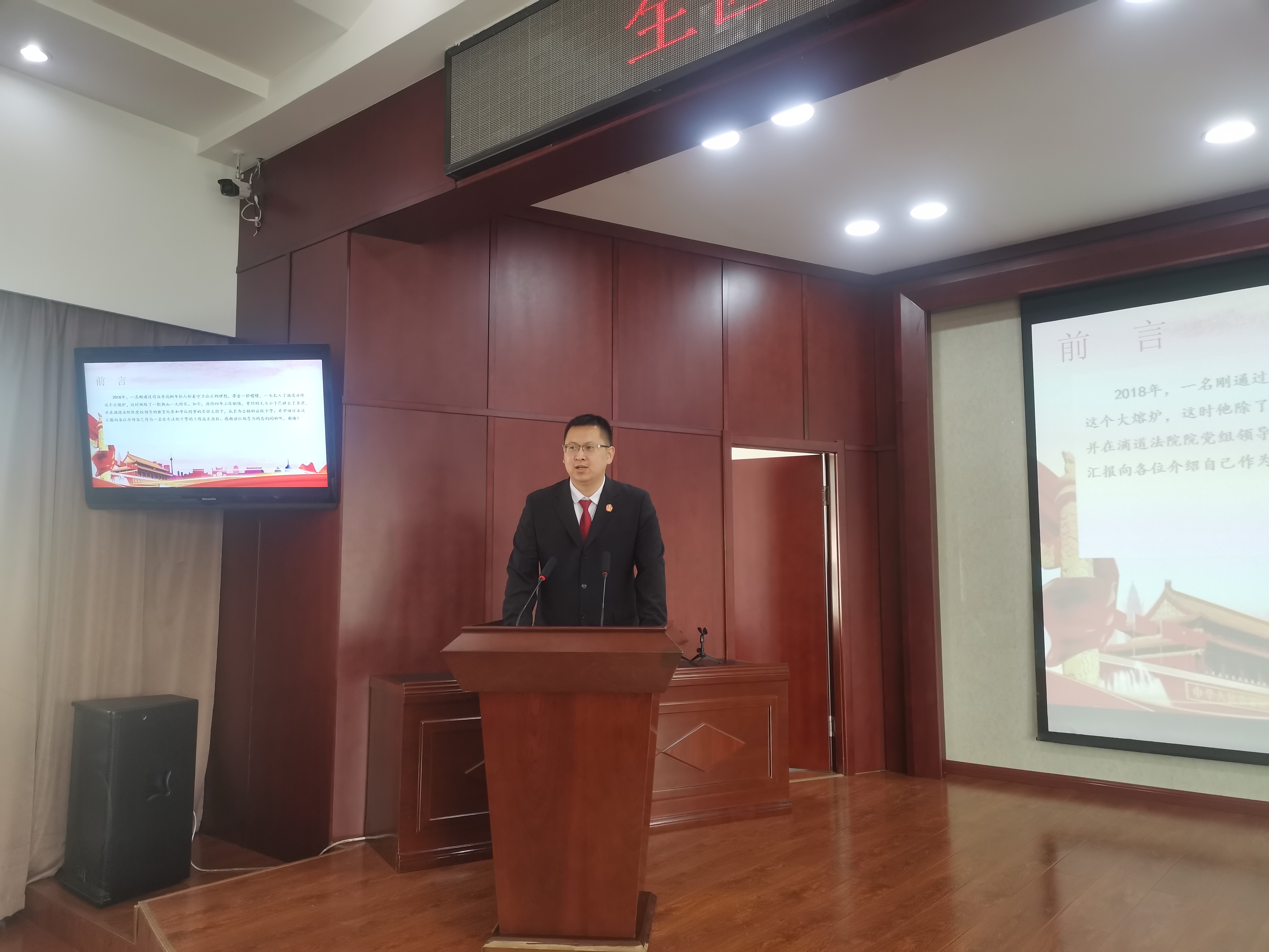 崔永霖作为法院先进干警做先进事迹报告,报告中,崔永霖以“青春逢盛世 奋斗正当时”为题,从个人的履历和业绩、自身的成长和经历、收获的成绩和肯定三方面入手,从不同角度讲述了他在不同岗位上的履职尽责、无私奉献为民服务的点点滴滴,体现了坚定的理想信念和对党忠诚的政治本色,彰显了勇于担当、敢于奉献的时代精神。