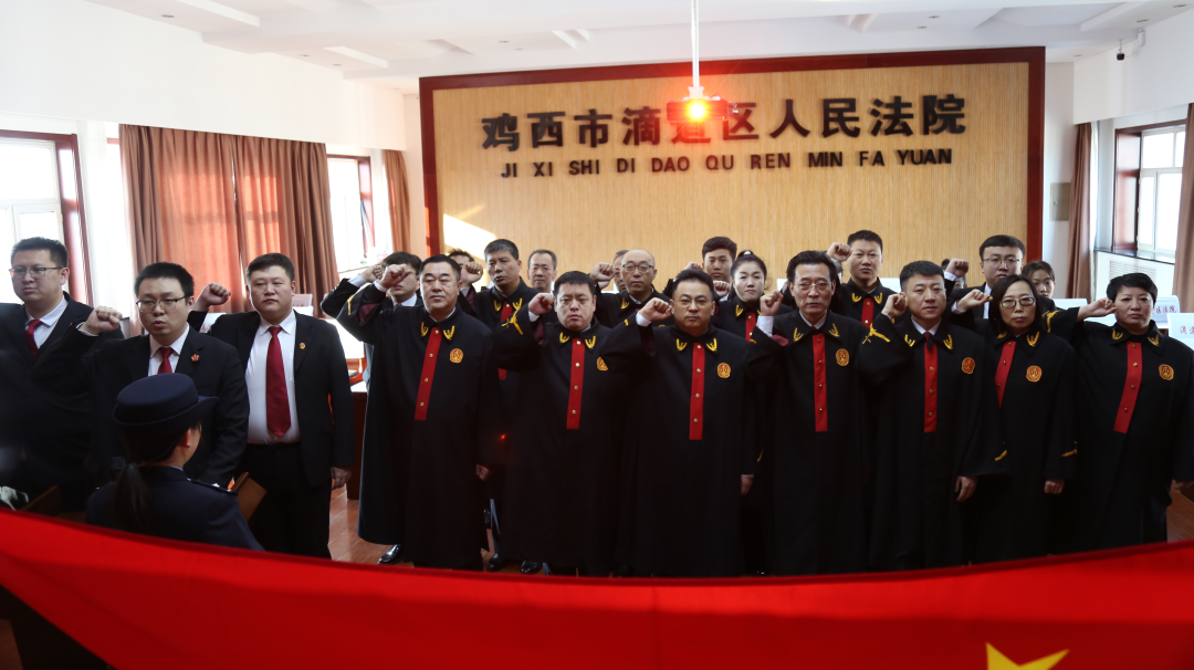 上午9时,宣誓活动开始,全体宣誓人面向国旗列队站立。滴道法院干警高举右手,庄严宣誓:“忠于中华人民共和国宪法,维护宪法权威,履行法定职责,忠于祖国、忠于人民,恪尽职守、廉洁奉公,接受人民监督,为建设富强民主文明和谐美丽的社会主义现代化强国努力奋斗!”