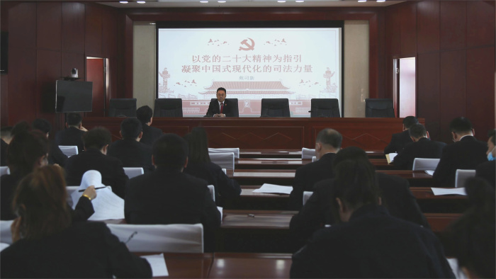 苑司新以“以党的二十大精神为指引 凝聚中国式现代化的司法力量”为题,从党的二十大的主要成果、全面掌握党的二十大主题、准确领会过去五年和新时代十年的伟大变革、充分认识党的二十大的重大意义,切实增强学习宣传贯彻的政治自觉思想自觉行动自觉、深刻领悟全面建设社会主义现代化国家的目标任务、勇于担当坚持全面依法治国、推动法治中国建设的历史使命、坚定不移全面从严治党、持之以恒推进正风肃纪反腐、切实加强党的二十大精神的学习贯彻八个方面与大家共同交流。