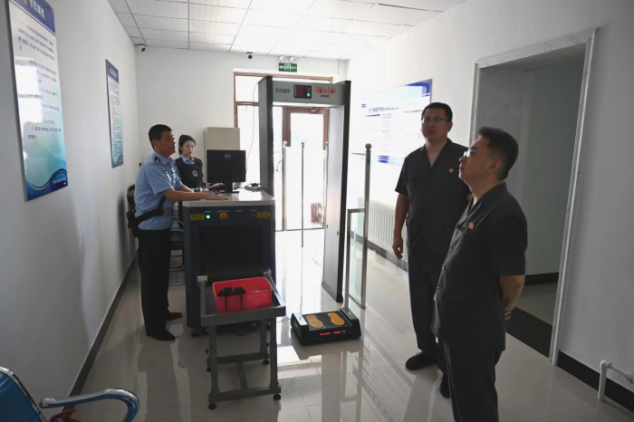 苑司新一行来到安检区以当事人身份体验安检流程,来到远程视频室查看了与市看守所远程视频对接过程,查看了诉讼服务大厅、科技法庭,详细了解了法庭党建文化建设等情况,与司法所入驻法庭工作人员进行了交谈。