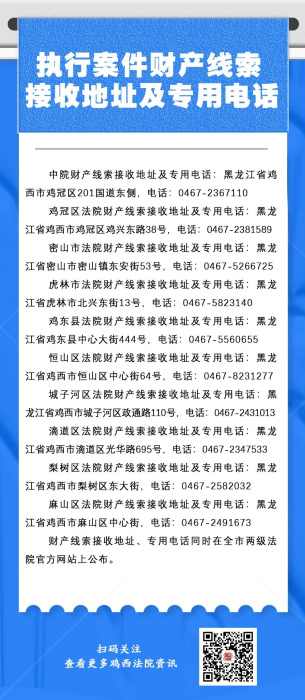 关于鸡西法院执行案件财产线索接收地址及专用电话的公告