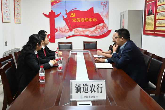走访期间开展了以“送法进银行助力优化营商环境”为主题的交流座谈,详细了解滴道农行的司法需求,对该行在经营中遇到的法律问题进行了答疑解惑、提供了具体指导;就优化法治化营商环境、改进司法作风等工作征求了建议。同时,结合金融行业不良资产清收,介绍了“诉前调解+司法确认”金融纠纷化解新模式,对推进金融纠纷多元化解和降低金融风险提出了合理化建议。