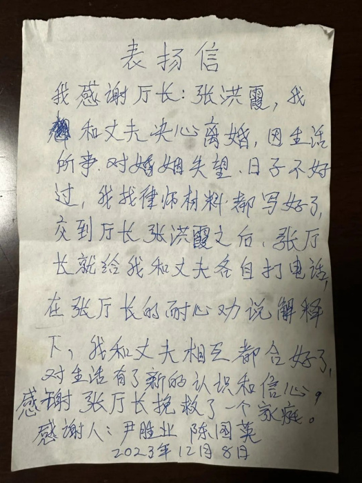 12月8日,滴道法院立案庭收到一份特殊的礼物。一位当事人手写表扬信致谢立案庭(诉讼服务大厅)副庭长张洪霞,当事人表示“我和丈夫和好了,对生活有了新的认识,感谢张法官挽救了我的家庭”。