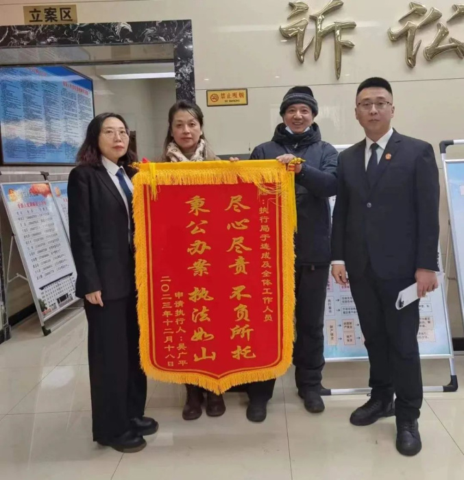 孙某于2021年欠吴某2万余元,吴某来到滴道法院申请执行。经工作人员多方查证未发现孙某下落,案件进入终结程序。近日,申请人吴某在浏览微信朋友圈时,无意间发现被孙某在哈尔滨市某酒店工作。吴某提供了该线索,接到线索后执行局立即赶往哈尔滨某酒店进行核查。通过酒店管理人员了解到孙某确为酒店工作人员,但当天未上班。通过酒店财务了解到了被执行人孙某的工资账号,通过查控冻结扣划将该案款执行完毕。为表感谢,吴某送来锦旗。