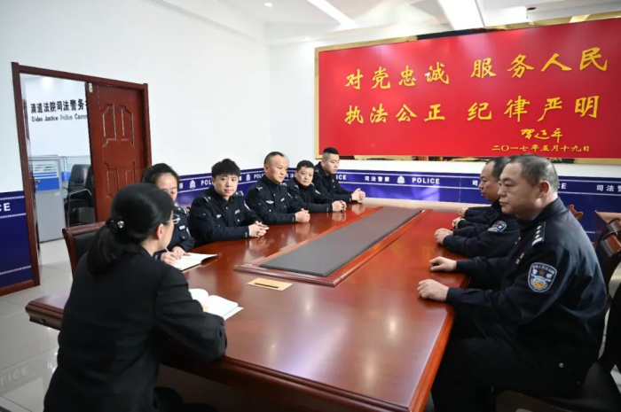 2024年1月10日是第四个“中国警察节”,滴道法院党组副书记、副院长高雪峰代表院党组为司法警察大队送去关心和祝福,与全体法警举行座谈。