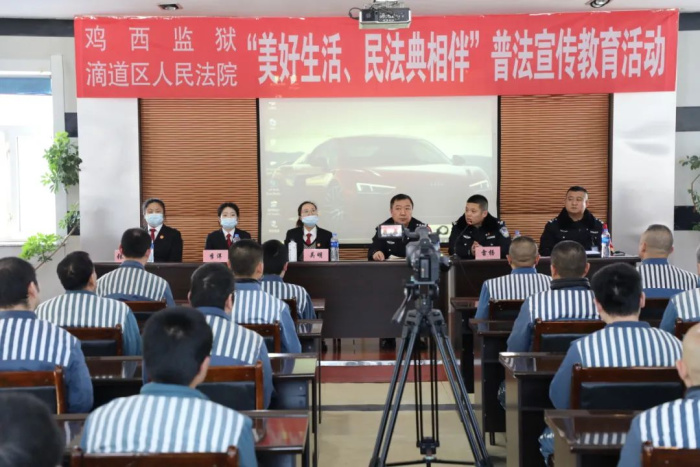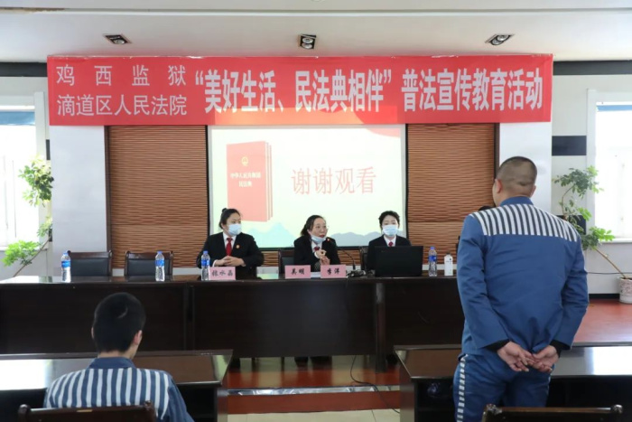 1月24日,鸡西监狱联合滴道区人民法院开展“美好生活、民法典相伴”普法宣传教育活动,滴道法院党组成员、执行局局长吴明一行三人参加活动。