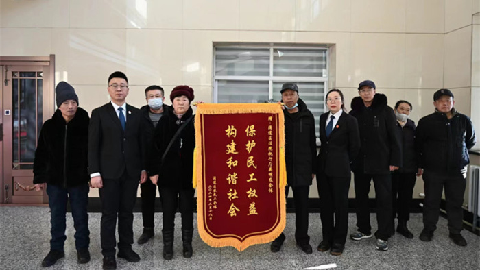 2月27日,一起涉及113名工人工资的执行案件代表来到滴道法院执行局,为执行局全体工作人员送上锦旗,表达感激之情。