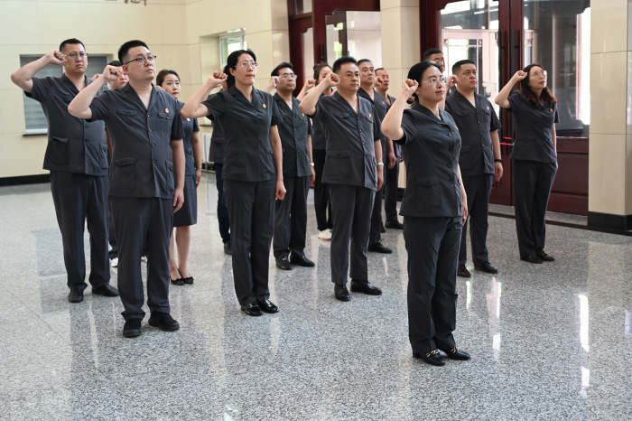 为庆祝中国共产党成立103周年,弘扬伟大建党精神,发挥党员先锋模范作用,滴道法院支部书记高雪峰带领党员干部开展重温入党誓词宣誓活动。