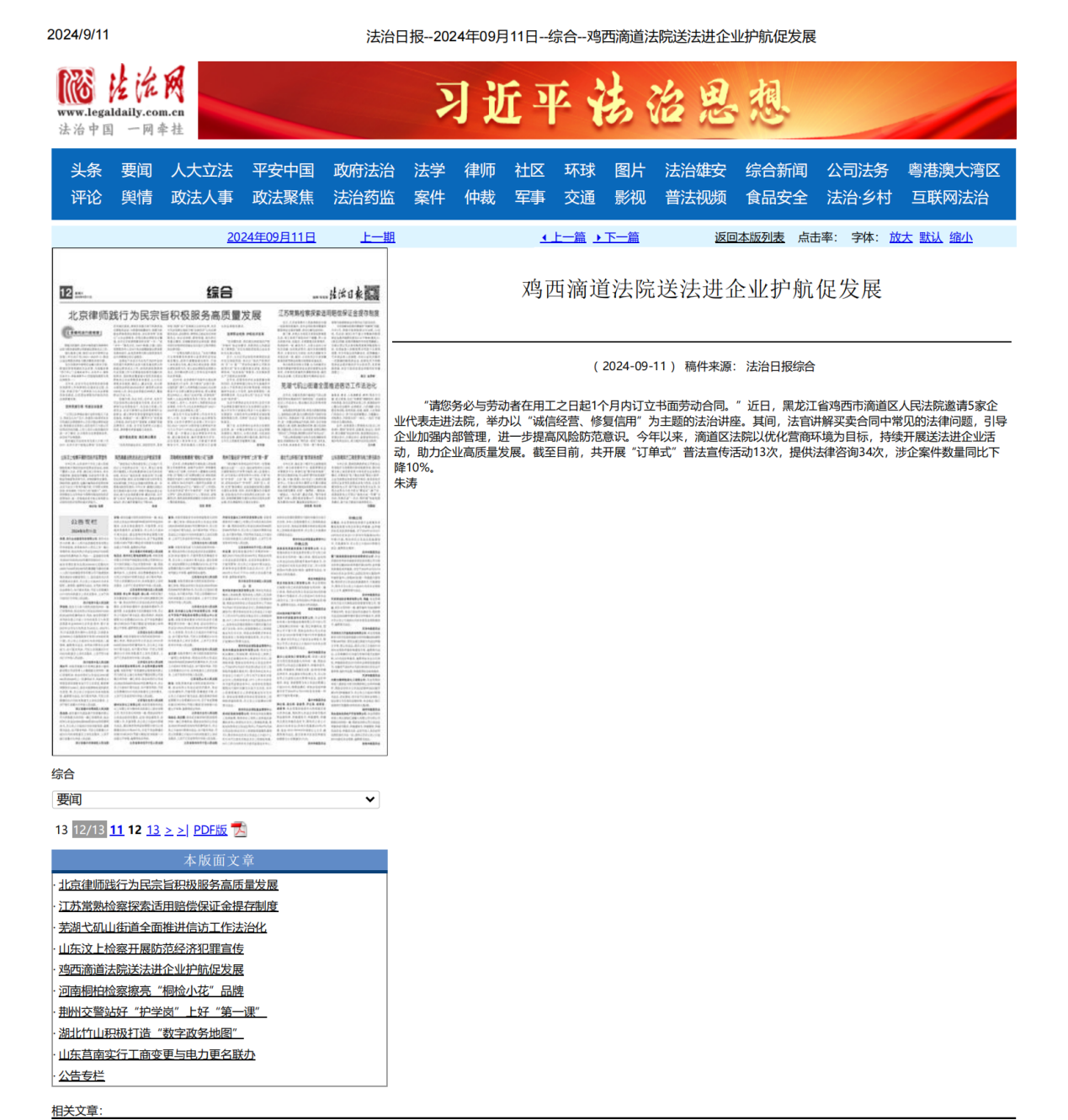 法治日报:鸡西滴道法院送法进企业护航促发展