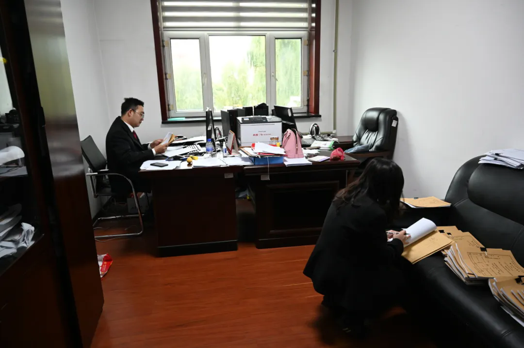 党组成员、执行局局长吴明与书记员孙丽伟整理卷宗