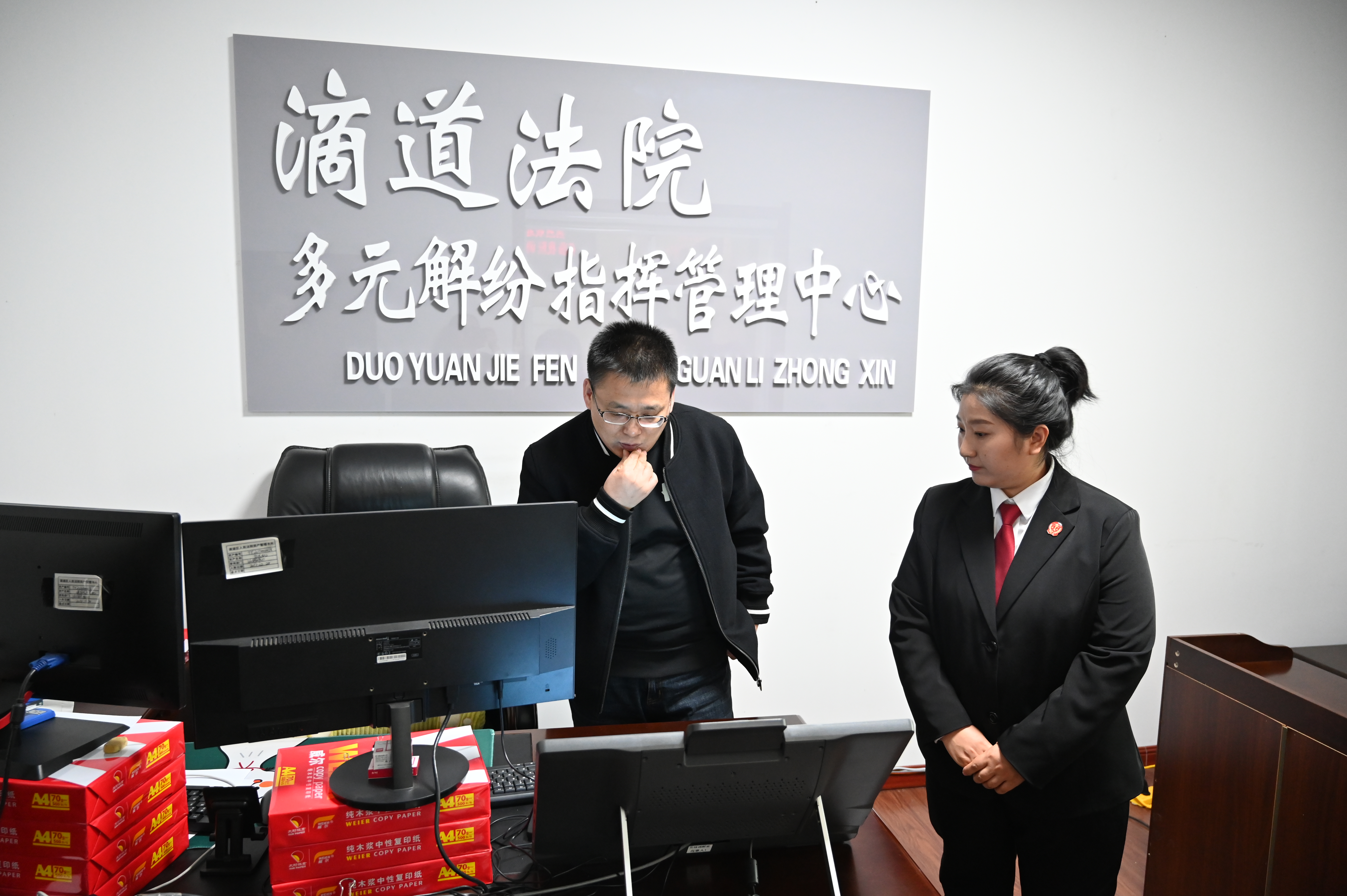 张立军一行对滴道法院诉讼服务中心、云上调解室、老法官工作室、家事法庭、数字化审判法庭、“龙法和”云法庭等进行调研指导,了解了立案工作的开展情况。滴道法院立案庭庭长朱雅楠详细讲解了“一站式”诉讼服务平台建设、“龙法和”云法庭开展情况、诉调对接机制建立情况、人民法院调解平台“三进”等工作推进情况。