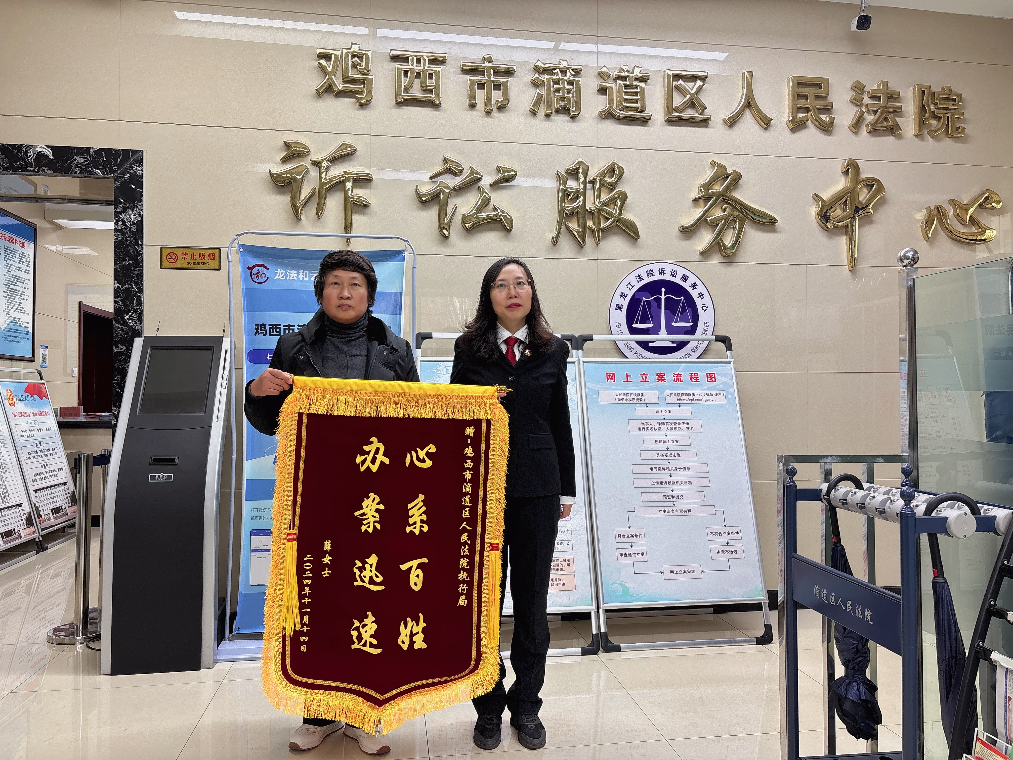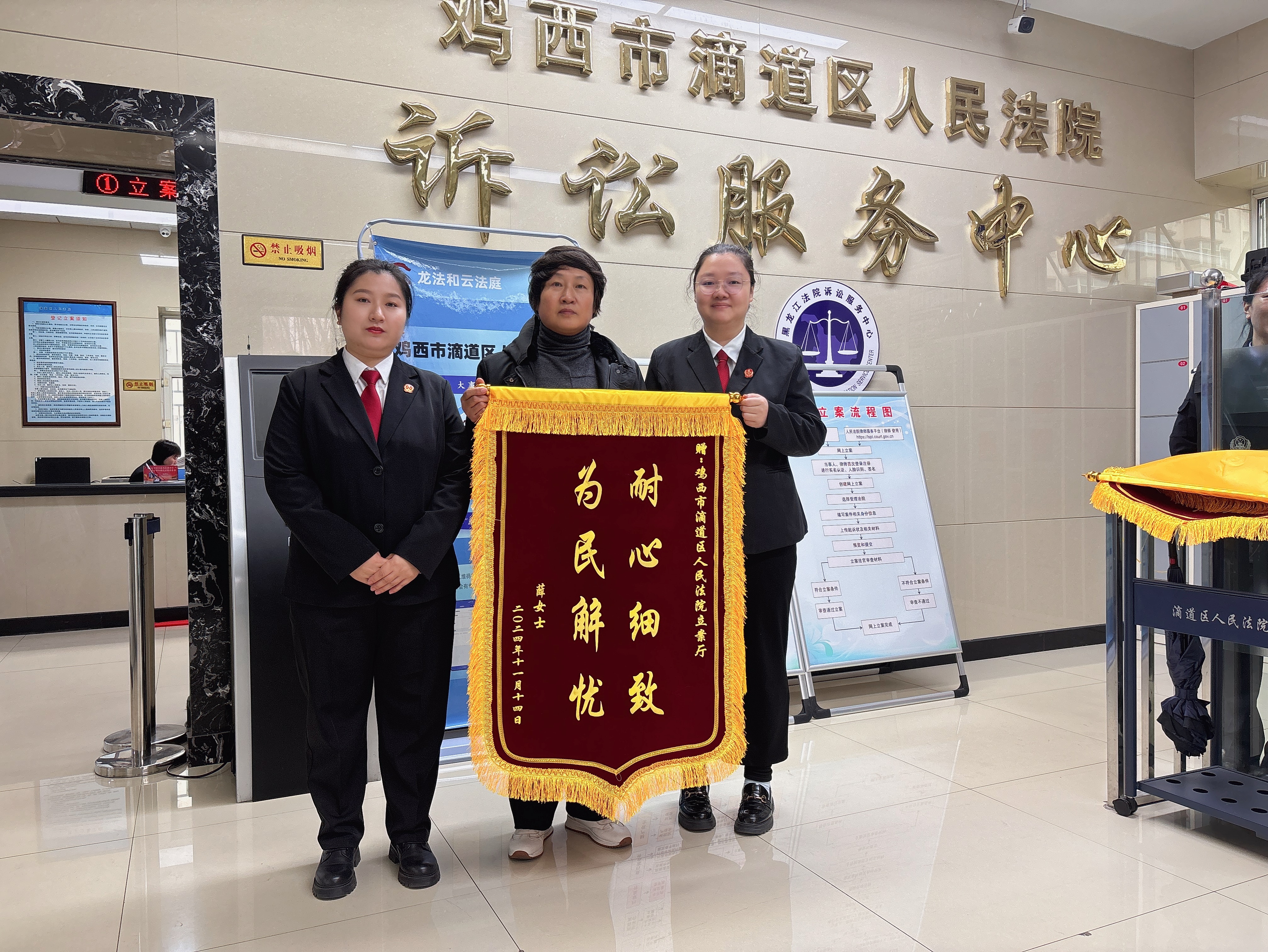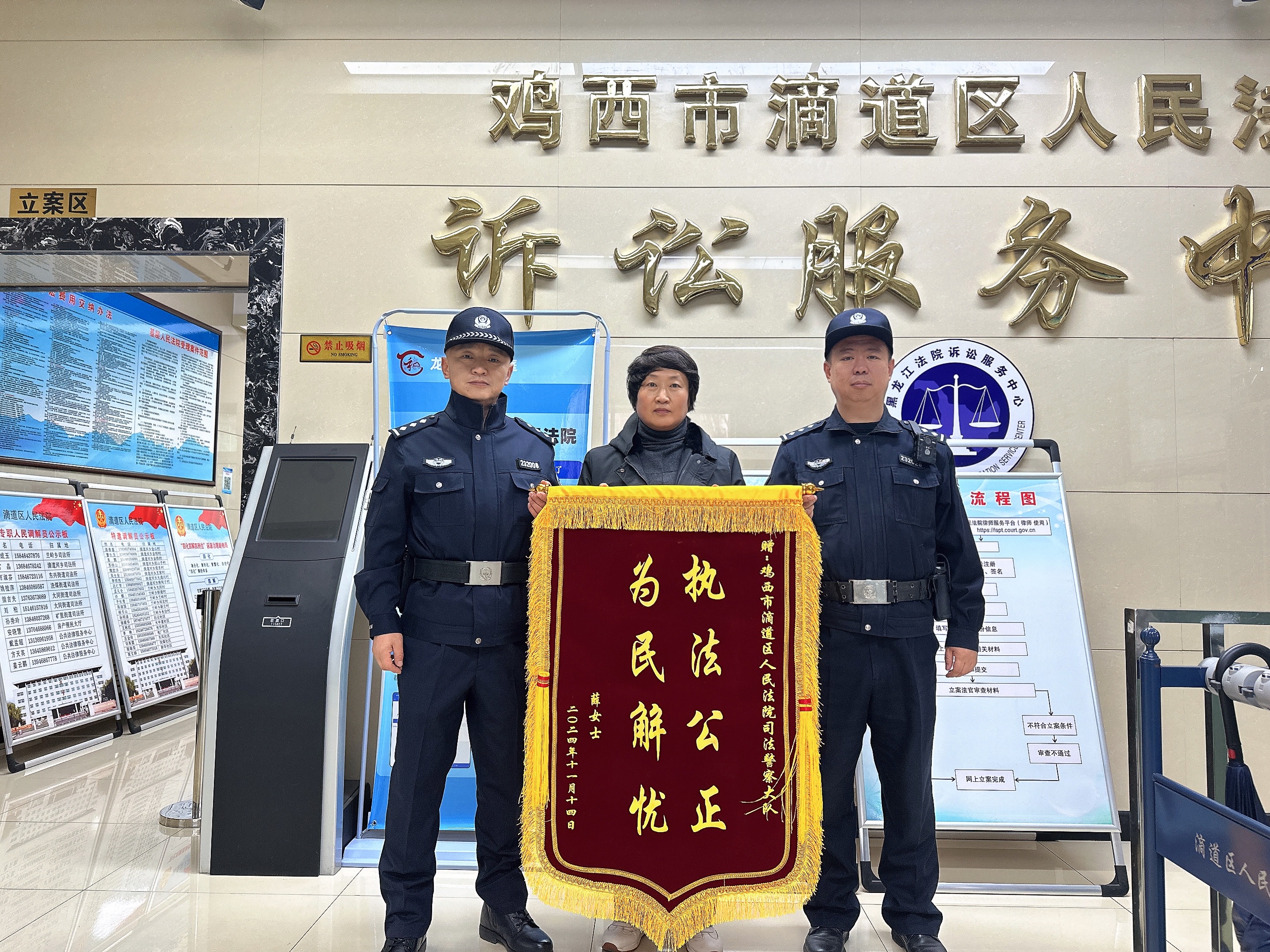 11月14日,一起抚养费纠纷案件当事人薛某来到滴道区人民法院,赠予立案庭、执行局、法警队三面锦旗,以表达对法院工作人员耐心帮助和快速执结案件的诚挚感谢。