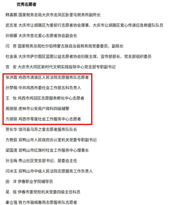 在2024年度黑龙江省志愿服务“四个100”先进典型学习宣传活动中,滴道法院志愿服务队志愿者张洪霞荣获全省“优秀志愿者”称号。