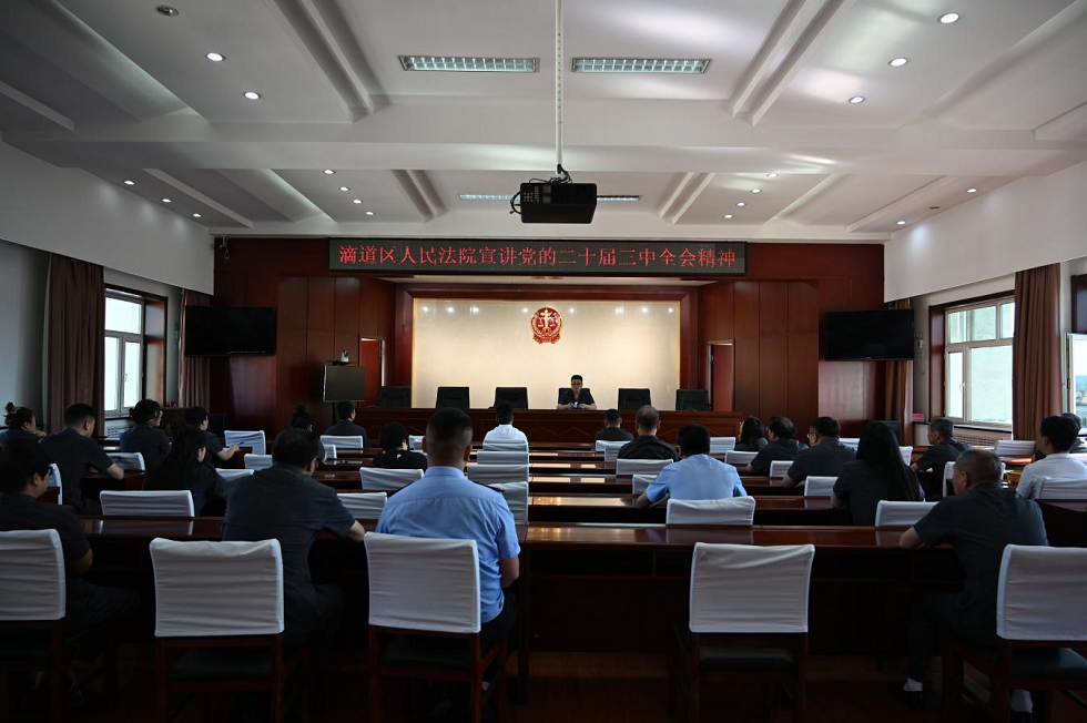 为深入学习贯彻党的二十届三中全会精神,引导全院干警把思想和行动统一到全会精神上来,9月2日,滴道区人民法院举办学习贯彻党的二十届三中全会精神宣讲会,区委宣讲团成员、滴道法院政治部主任朱涛作宣讲报告。