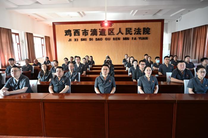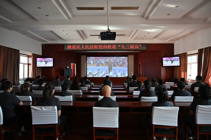 9月3日,纪念中国人民抗日战争暨世界反法西斯战争胜利80周年阅兵式在天安门广场隆重举行。滴道区人民法院组织全体干警集中观看阅兵式直播,共同感受这一庄严而激动人心的时刻。