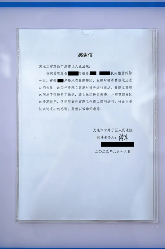 近日,滴道区人民法院立案庭收到了一封来自大连市甘井子区人民法院的感谢信,信中对滴道法院立案庭在一起跨地域民间借贷纠纷案件中所给予的高效协作和大力支持表示衷心感谢。这一纸信函,不仅是对滴道法院工作的充分肯定,更是滴道法院司法为民精神的生动体现。
