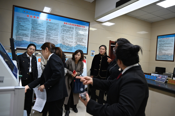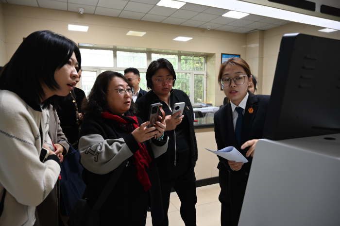 在讲解员的引导和讲解下,依次参观了诉讼服务中心、科技法庭、老法官工作室、党建文化室等场所。在诉讼服务中心,代表们了解了便捷的立案流程和智能诉讼服务设施,体验了“一站式”便民服务。