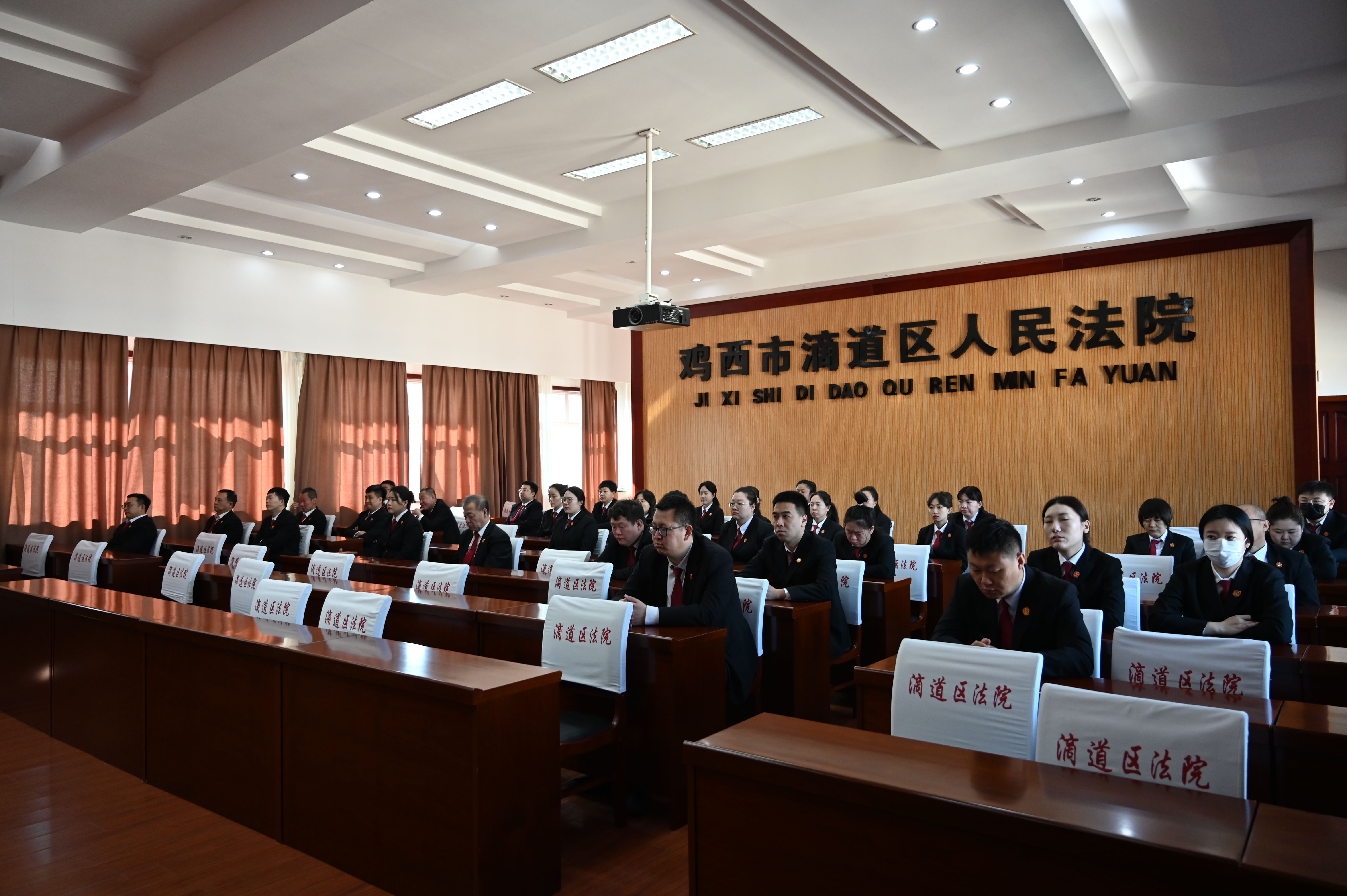 区委政法委副书记刘相生,滴道区纪委监委派驻区委政法委纪检监察组组长李悦霖,滴道法院全体干警参加会议。