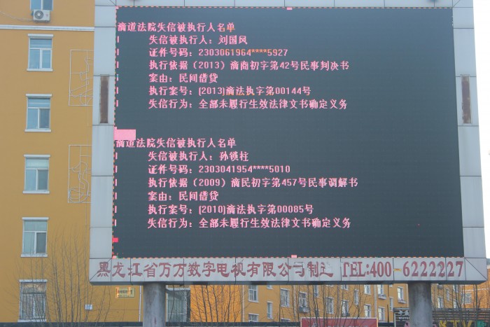 配合执行会战统一行动,滴道法院将第一批35人失信“老赖”名单公布在滴道区政府广场前大屏幕上。