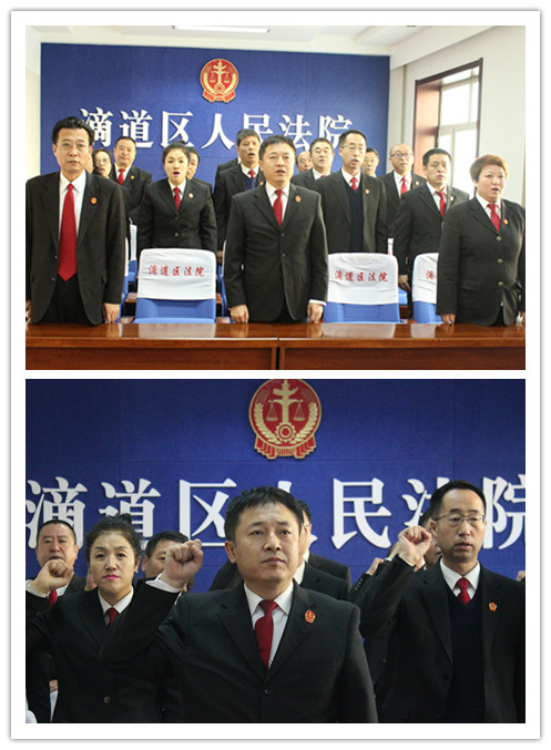 “我宣誓:忠于中华人民共和国宪法,维护宪法权威,履行法定职责,忠于祖国、忠于人民,恪尽职守、廉洁奉公,接受人民监督,为建设富强、民主、文明、和谐的社会主义国家努力奋斗!宣誓人…”,上午10时15分,滴道法院内,17名员额法官统一着装在党组书记、院长赵鸿江的带领下,齐唱国歌后向中华人民共和国宪法作出庄严承诺。铮铮誓言表达了人民法官忠于宪法法律,捍卫公平正义的决心。