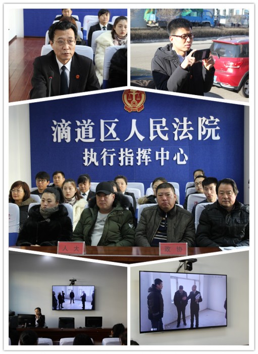 2月6日上午,11名区人大代表、政协委员和区纪检部门的工作人员在滴道法院执行指挥中心远程观摩了一起执行案件。滴道法院党组副书记、副院长张君起坐镇指挥中心通过单兵执法取证仪进行现场指挥。