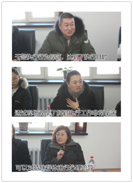 执行活动结束后,滴道法院干警与区人大代表、政协委员进行了座谈。代表委员对这次执行活动给予了高度评价和充分肯定,不仅加深了人大代表、政协委员对法院执行工作的了解,还进一步提高了执行工作的公开透明度及执行工作的规范化程度,希望今后观摩、见证执行工作能够常态化,让更多的群众理解、支持法院工作。